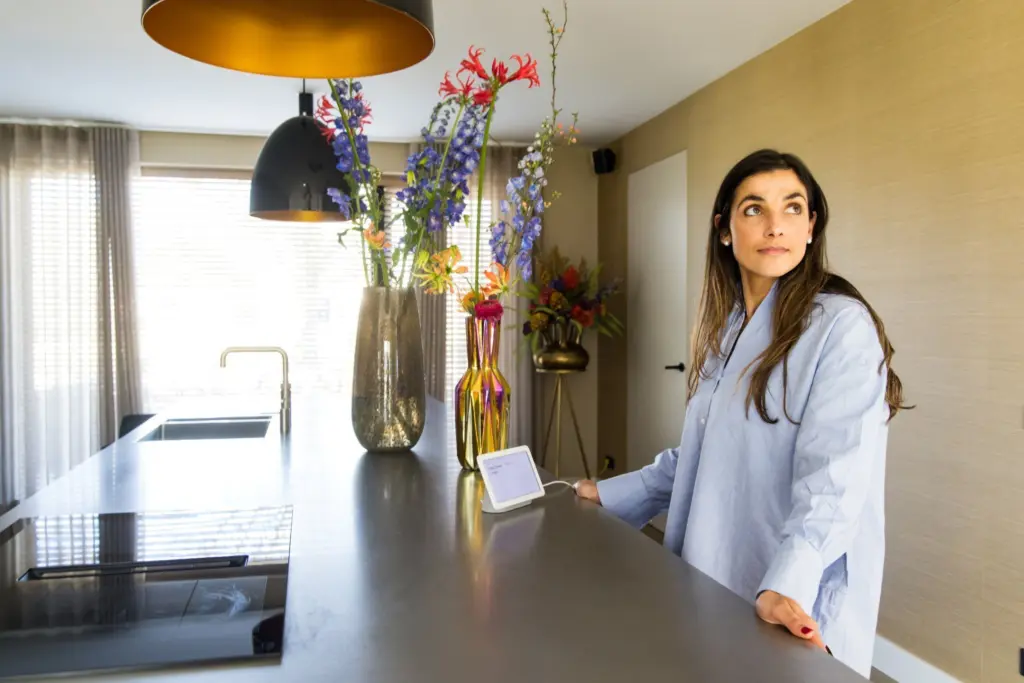 Depuis notre cuisine ouverte, je commande les rideaux de toute la maison avec notre enceinte connectée.